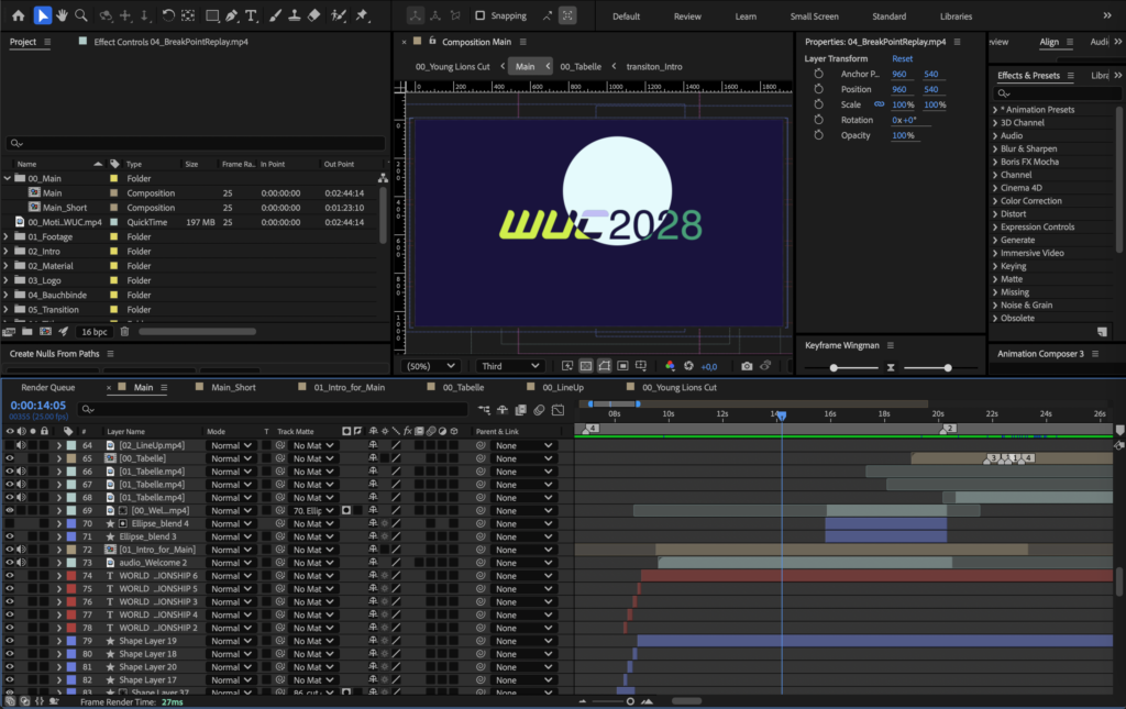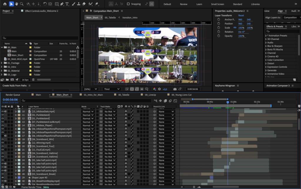 Im Rahmen des Semesterprojekts Motion Branding im Sport entwickelte ich ein umfassendes Set an Motion-Assets für den Broadcast der Ultimate Frisbee Weltmeisterschaft. Der Schwerpunkt lag auf der Gestaltung und Animation dynamischer Broadcast-Graphics. Mit der erstellung der Assets ging das gestalten eines eigenen kleinen Brandings des Events einher, mit Logo, Farb- und Typografiekonzept. Formsprache, Timing und Bewegungen der Assets sind auf die explosive, schnelle Spielweise von Ultimate Frisbee abgestimmt.